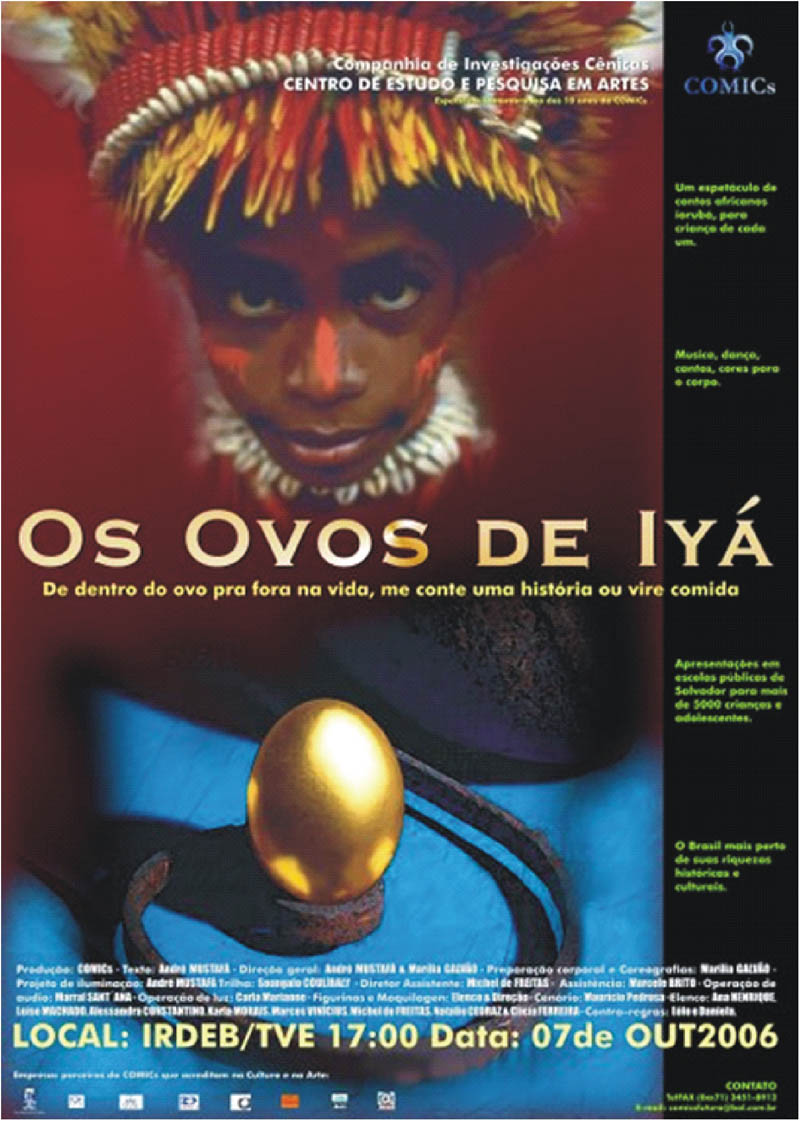 Além de dirigir André Mustafá escreveu Os Ovos de Iyá e interligou toda a trama com contos sobre Orixás. As apresentações foram no Teatro do Instituto de Radio Difusão Educativa da Bahia - IRDEB/TVE e em diversas escolas da rede publica; municipal e estadua; tendo no final de cada apresentação um debate sempre rico e questionador com o publico.