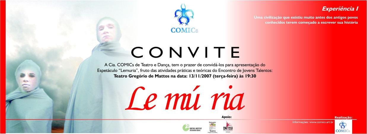 O Instituto Cultural Brasil Alemanha - ICBA, abri as portas para o espetáculo LEMÚRIA dirigido por André Mustafá, Marilia Galvão, Michel de Freitas e Alan Miranda. LEMÚRIA também chamada Mu, é o nome de um suposto continente perdido, localizado no Oceano Índico ou no Oceano Pacífico. A idéia teve origem no século XIX, pela teoria geológica do Catastrofismo, mas desde então tem vindo a ser adotada por escritores do Oculto, assim como pelo povo Tâmil, da Índia. Relatos sobre a Lemúria diferem quanto à maioria dos pormenores.
